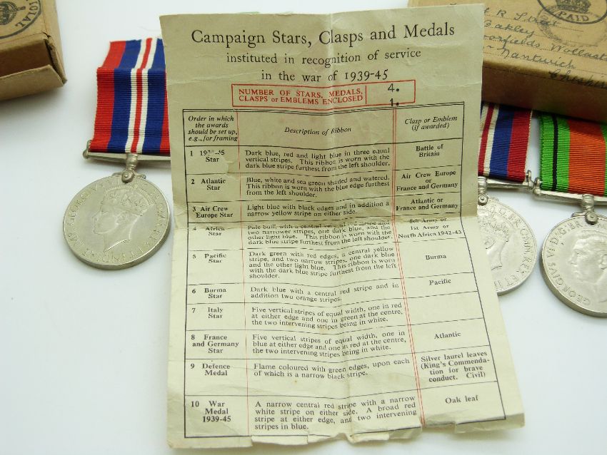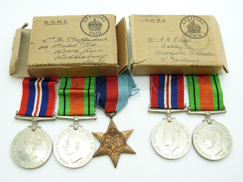 British Forces WWII boxed medals comprising 1939/1945 Star, Defence Medal and War Medal addressed to Mrs M Huffadine. L/Cpl Huffadine REME was killed on the 15/04/1943 whilst attached to 83 Anti Tank Regiment RA. Together with a Defence Medal and a War Medal addressed to F Street, Nantwich