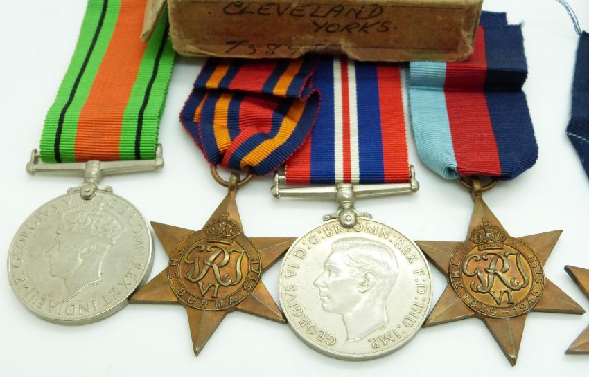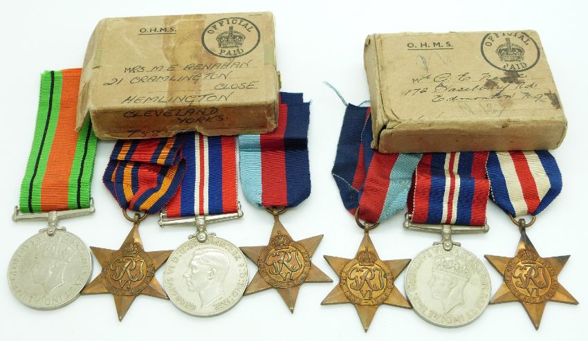 British Forces WWII boxed medals comprising 1939/1945 Star, France & Germany Star and War Medal, addressed to G Neal, Edmonton together with the 1939/1945 Star, Burma Star, Defence and War Medal addressed to M Renahan, Cleveland