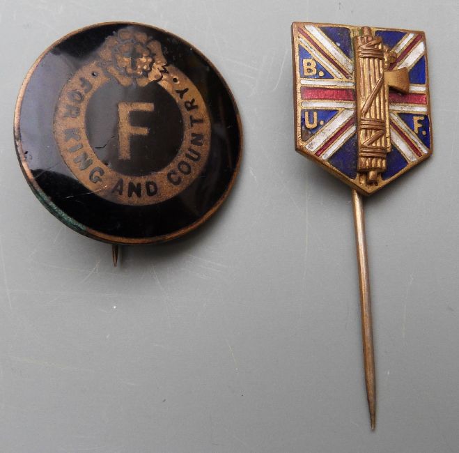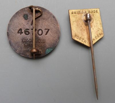 British WWII Fascist Party enamel badge A46707, Birmingham maker, together with a similar pin badge