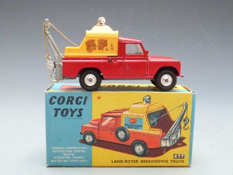Corgi Toys diecast model Land-Rover Breakdown Truck with red body, yellow cover and silver crane and spotlight, 477, in original box.