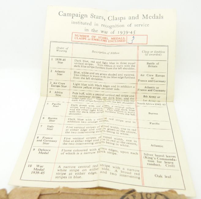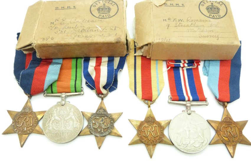 British Forces WWII boxed medal comprising 1939/1945 Star, France & Germany Star and Defence Medal, addressed to E Anderson, Glasgow together with 1939/1945 Star, Africa Star and War Medal addressed to F Romaine, Surrey