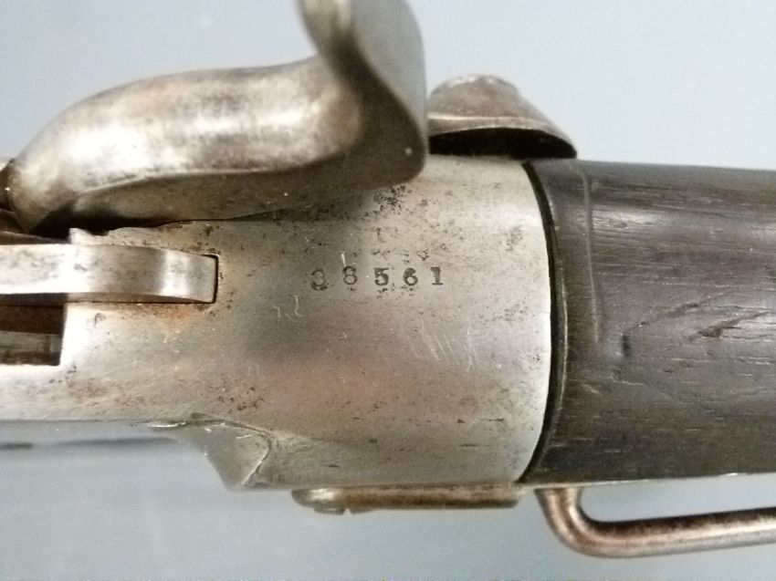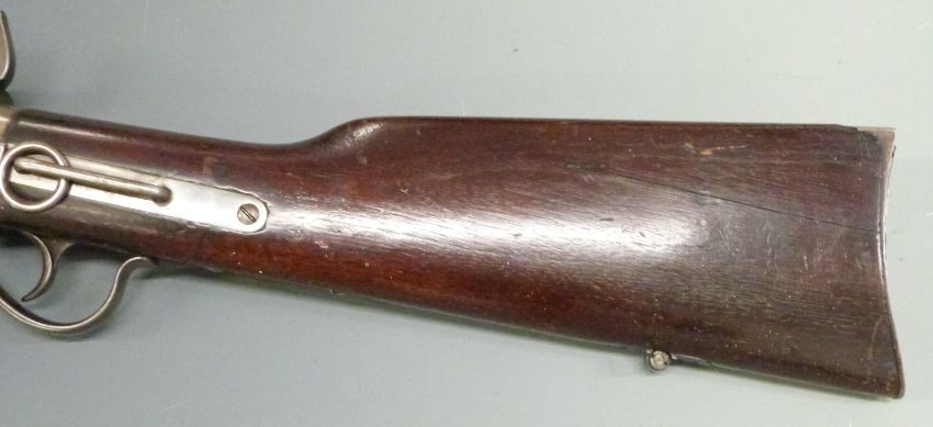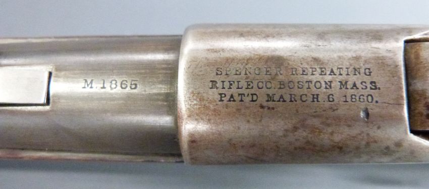 Spencer model 1865 .50 calibre underlever repeating percussion hammer action carbine rifle with pop-up ladder sights, stock stamped with indistinct markings, belt loop, top flat stamped 'Spencer Repeating Rifle Boston Mass Pat'D March 1860' and 20 inch barrel, overall length 94cm, serial number 10256.