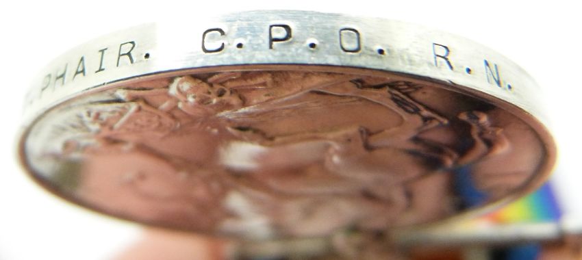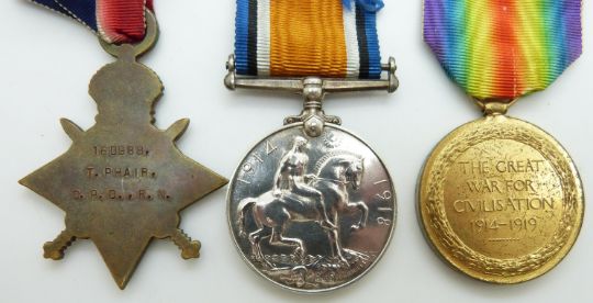 Royal Navy WWI medals comprising 1914/15 Star, War Medal and Victory Medal named to 160988 Chief Petty Officer T Phair, RN with copy of paperwork