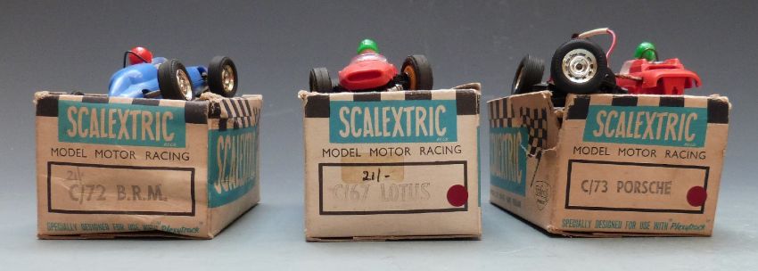 Three Tri-ang Scalextric model motor racing cars Lotus C67, B.R.M. C72 and Porsche C73, all in original boxes together with a collection of spare tyres.