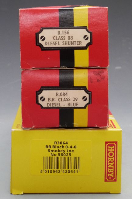 Three Hornby 00 gauge BR locomotives BO-BO Class 29 diesel electric 6124 R084, 0-4-0 Smokey Joe 56025 R3064 and 0-6-0 Class 08 diesel electric 13012 R156, all in original boxes.