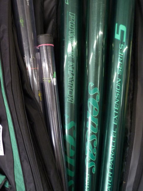 Sensas Serie 5XL 13metre pole, Power Match Parallel Extension Series 5, multiple tips and poles, predominately Sensas, all in a branded Sensas rod holdall, together with bank sticks, umbrella, Preston Innovations Pro Flat Roller etc