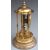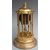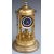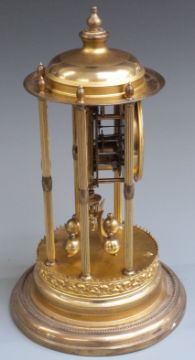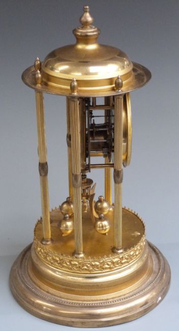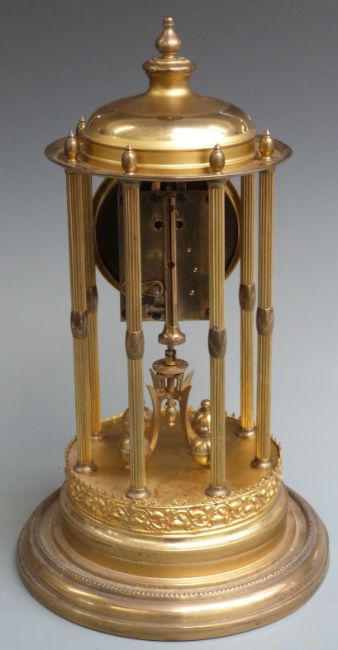 German brass anniversary clock with six reeded columns, blue enamelled dial and contrasting white Arabic chapter ring, 41cm tall