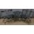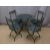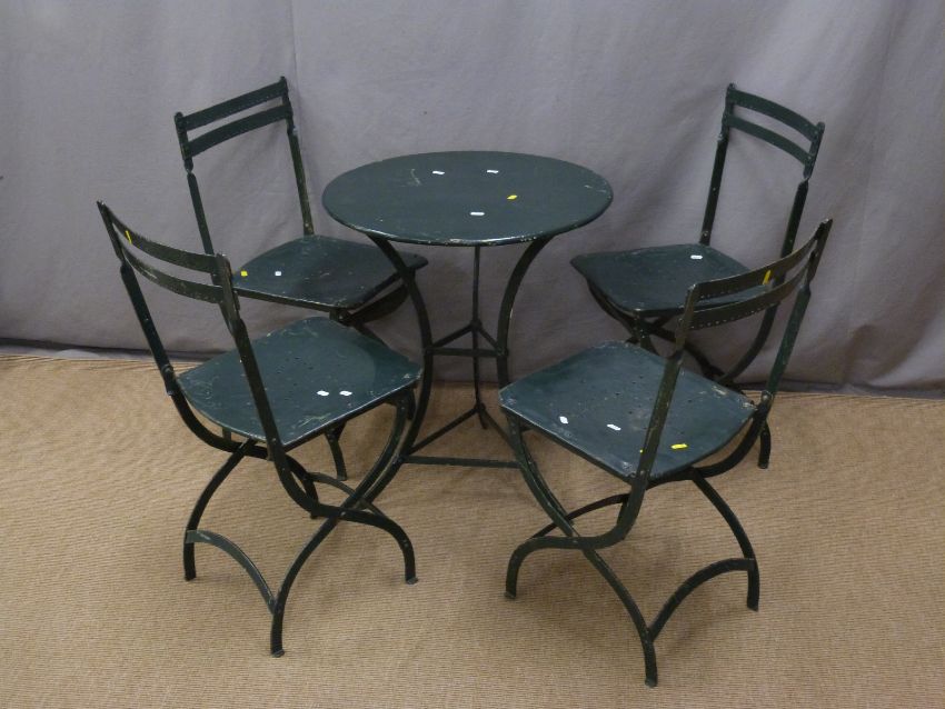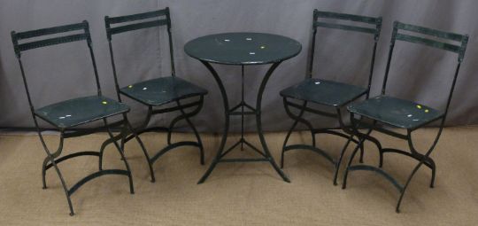 Set of four green metal folding garden chairs with table, diameter 60cm