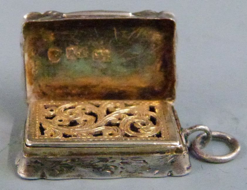 Victorian hallmarked silver vinagrette with engraved decoration and pierced gilt inner cover, marks obscured but Birmingham circa 1860's maker Alfred Taylor, length 3cm