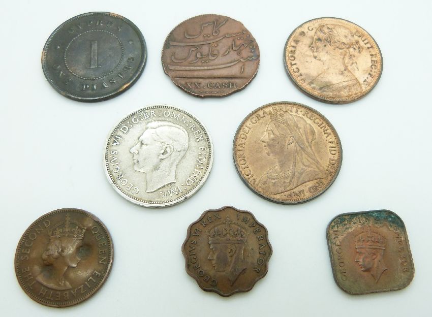 Cyprus one plastre Queen Victoria 1879 together with East India Company coins, 1808, further Cyprus examples a 1938 silvered penny, VF Victorian 1861 penny etc.