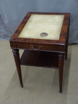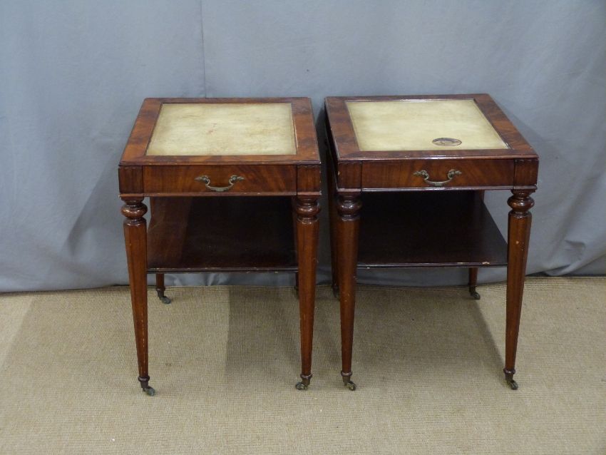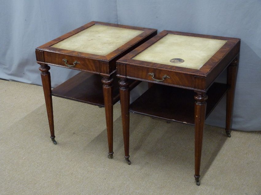 Pair of 19thC style side or occasional tables with leather inset tops, single drawer to end and shelf below, raised on octagonal tapering legs, L65 x W50 x H69cm
