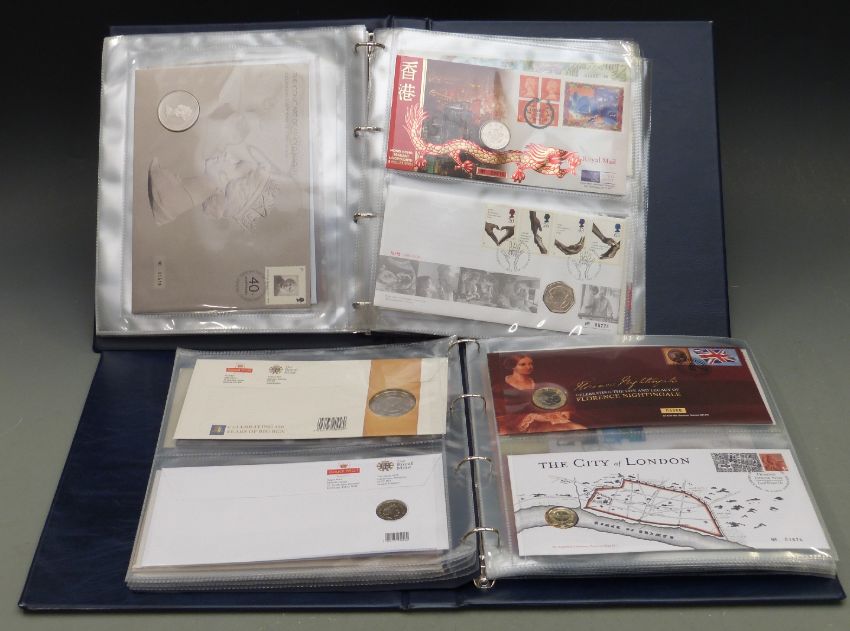 Royal Mail/ Royal Mint philatelic numismatic covers in two albums, covering a diverse range of commemorations including military, sport, aviation and Royal landmarks