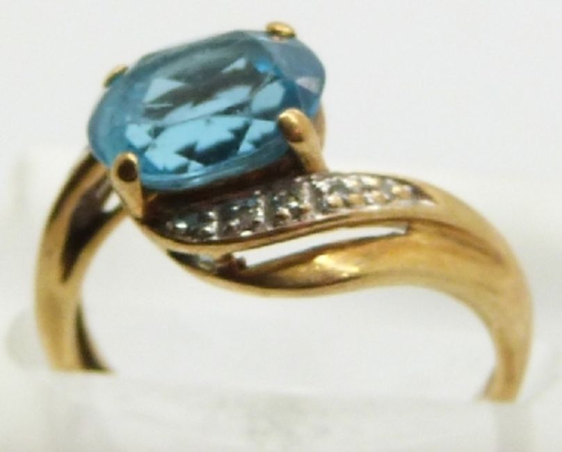 Two 9ct gold rings set with blue topaz and diamonds, 4.5g
