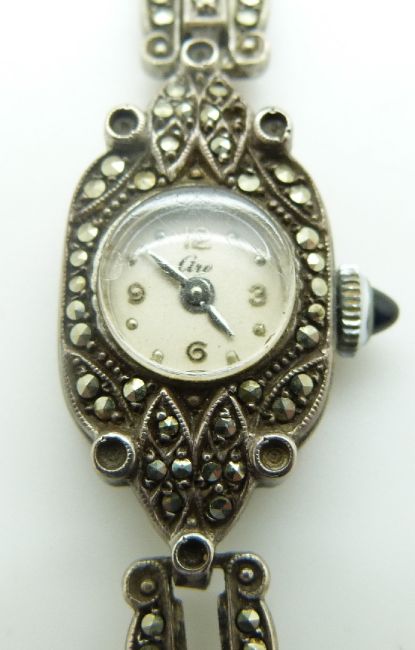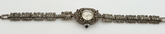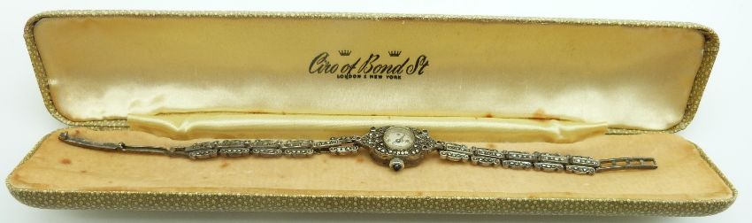 A silver watch set with marcasite in original Ciro of Bond Street box
