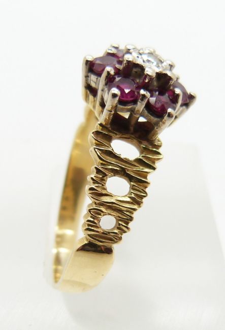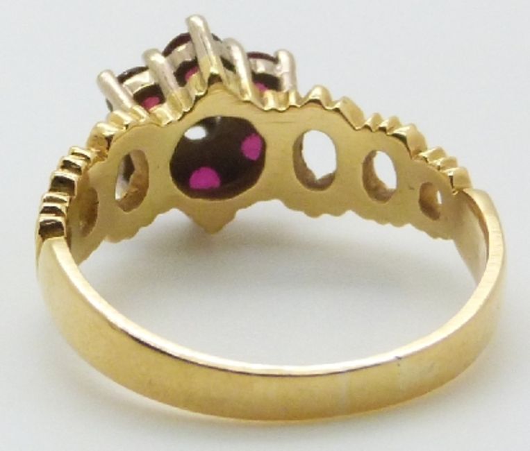 An 18ct gold ring set with rubies and a diamond in a cluster, 4.8g, size P/O