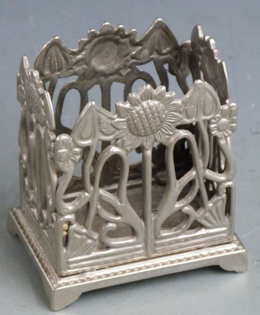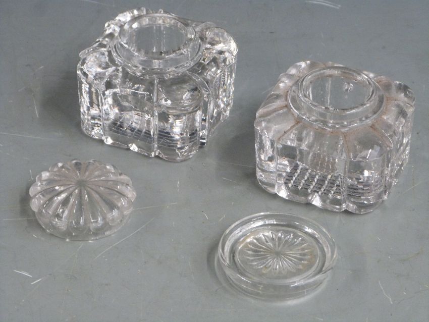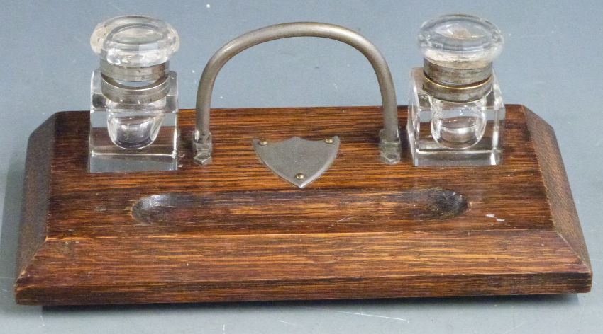 A collection of inkwells, desk tidies and a Walker & Hall cruet / tantalus stand