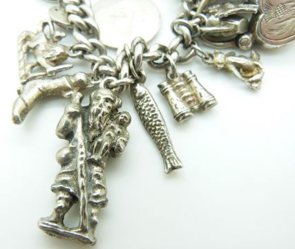 A silver charm bracelet with a large quantity of charms including ladybird, St Christopher, dog, fish, monkey etc