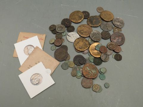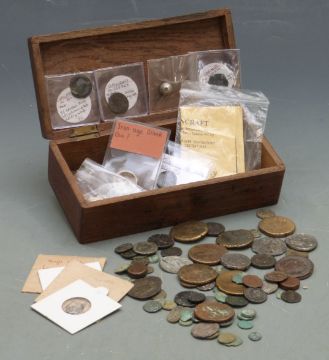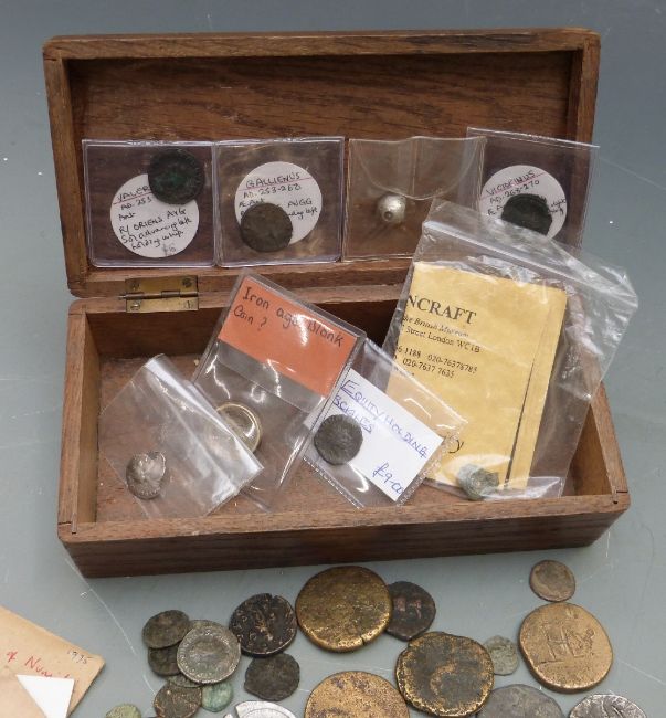 A collection of Roman and other coins includes some silver examples Gallienus, Valens, Valerian I and Victorinus in wooden box.