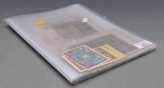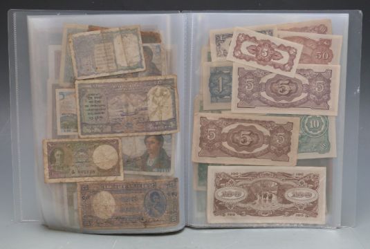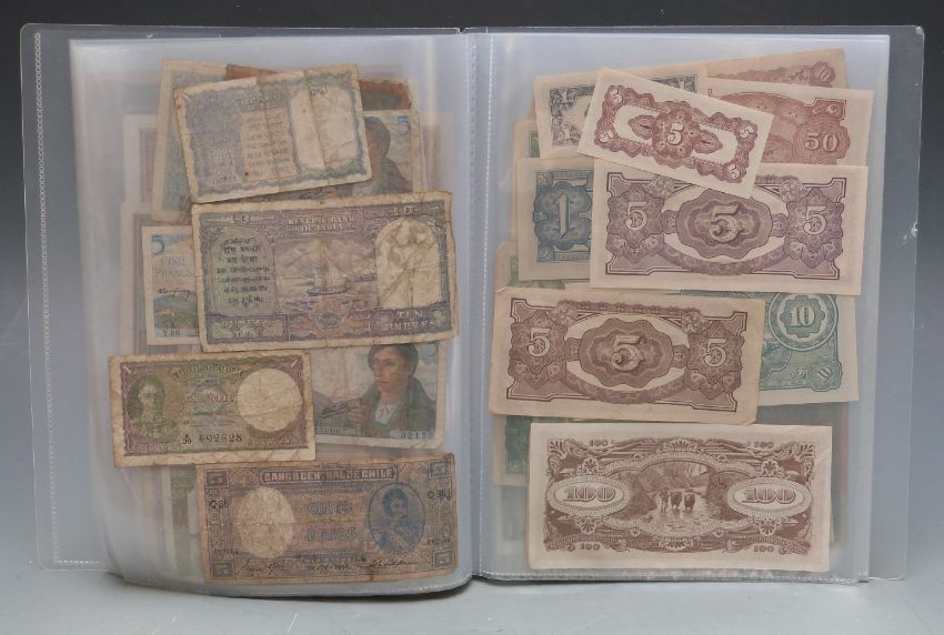 Over sixty world banknotes in a collector's folder to include Germany, China, Chile, Austria, Australia, USA, France, India, Burma and Japan etc