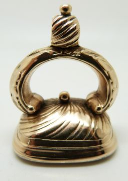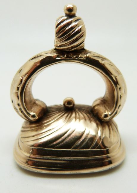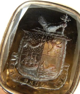 A late Victorian seal/intaglio set with a carved smoky quartz in a foiled setting depicting coat of arms and reading Tout Jours Pret