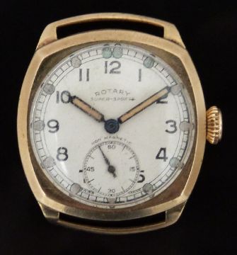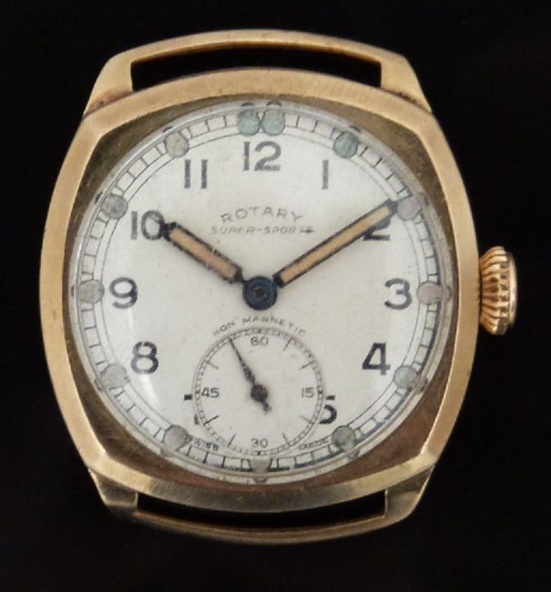 Rotary 9ct gold gentleman's wristwatch with inset subsidiary seconds dial, luminous blued hands, black Arabic numerals, silver dial, cushion shaped case and signed 15 jewel calibre 440 movement, case diameter 29mm,serial number 91746.