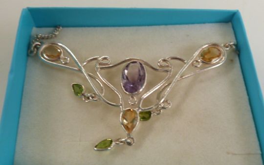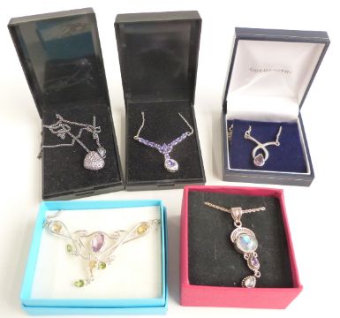 Five silver necklaces set with amethysts, peridot, labradorite etc