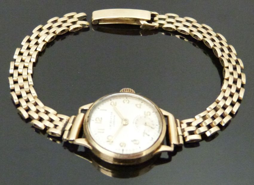 J W Benson 9ct gold ladies wristwatch with inset subsidiary seconds dial, gold hands and Arabic numerals, silver dial and signed Cyma 17 jewel calibre R424 movement, on 9ct gold bracelet, case diameter 21mm, serial number 399479, 18g