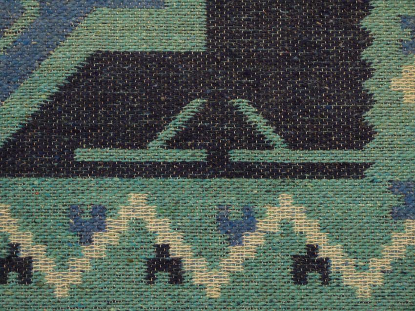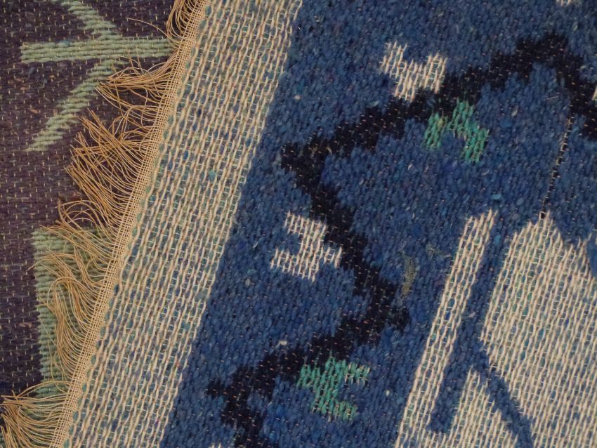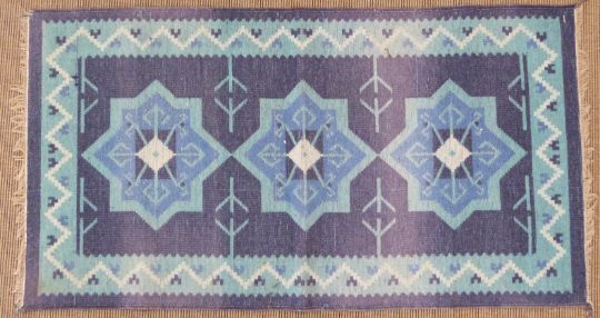 Retro 60's/70's kilim with deep blue ground and central star design, 127 x 67cm