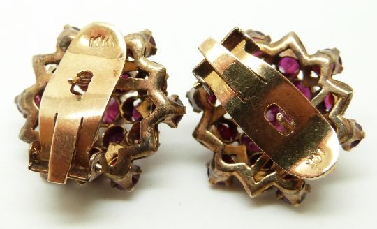 A pair of 14k gold earrings set with clusters of round cut rubies, 2.2cm diameter, 10.6g