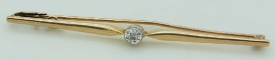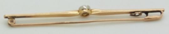 A 9ct gold bar brooch set with an old cut diamond measuring approximately 0.2ct