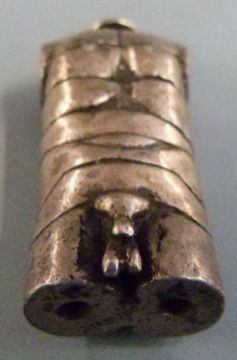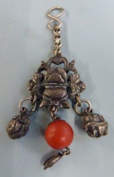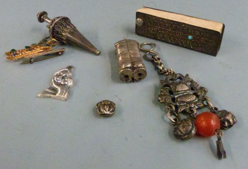 Novelty white metal pendant formed as a male torso marked sterling, hanging scent bottle, further pendant and an address book with 'Souvenir from Israel' cover marked silver, length 6.5cm