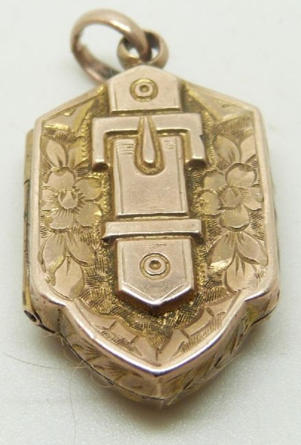 Victorian buckle locket with engraved decoration, 1.5 x 2cm