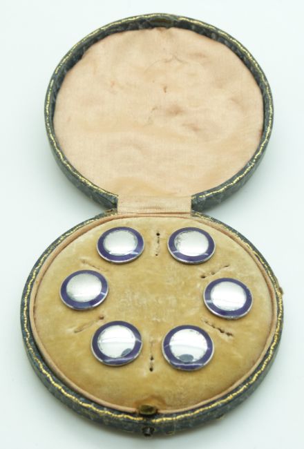 A set of six hallmarked Edwardian silver buttons set with blue enamel in original box, Birmingham 1908