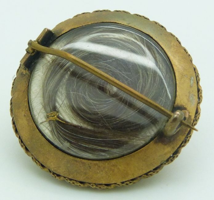 Victorian Etruscan Revival brooch with wirework and sphere design verso glass compartment, 3.3cm