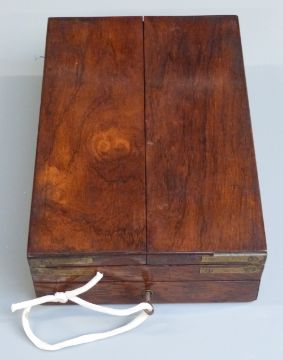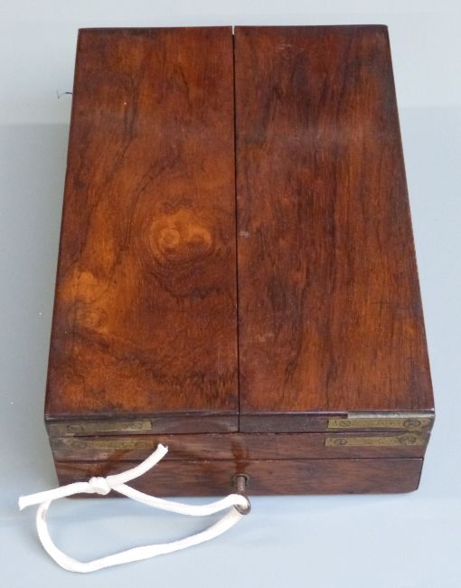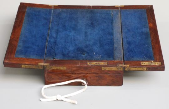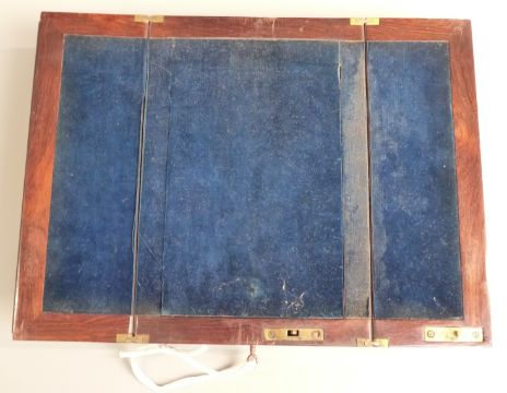 19th century rosewood travelling or campaign writing slope or lectern, the top folding out to form a velvet inset surface with storage behind, the whole surface being raised on an adjustable ratchet stand, length of box when closed 24cm