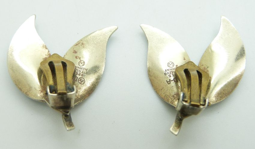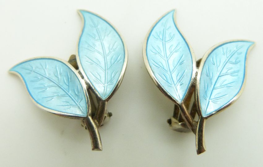 David Andersen, Norway silver leaf earrings set with blue enamel