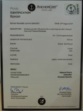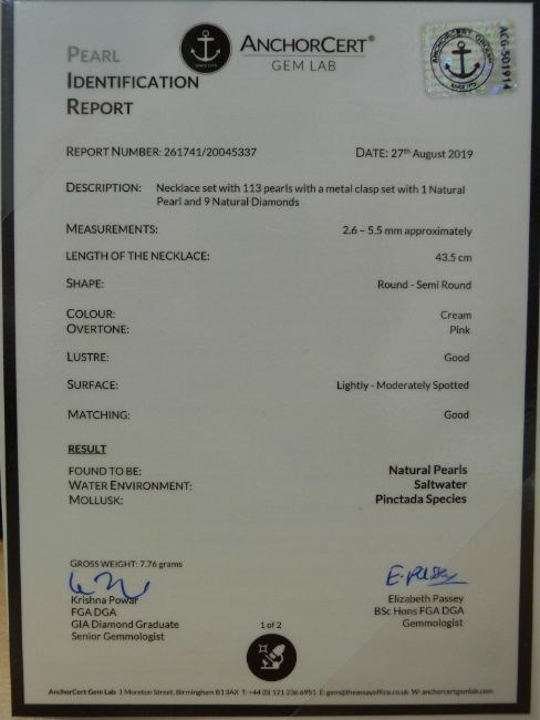 A single strand of natural pearls with diamond and pearl clasp, with AnchorCert report, 7.8g
