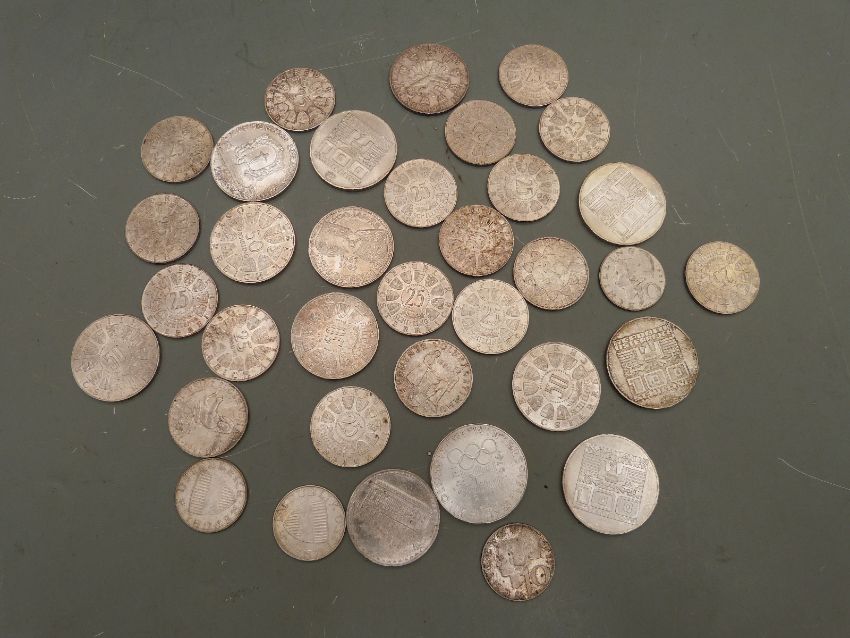 A collection of Austrian silver coinage, largely uncirculated, includes Winter Olympic Commemorative 100 schilling examples, 35 coins in all, 552g