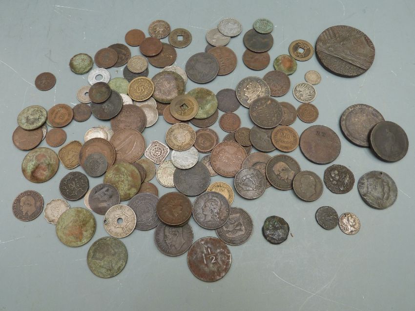 A collection of largely overseas coins, 18thC onwards, includes a George II and Charlotte commemorative, Lusitania coin and a Roman example, all in a leather purse