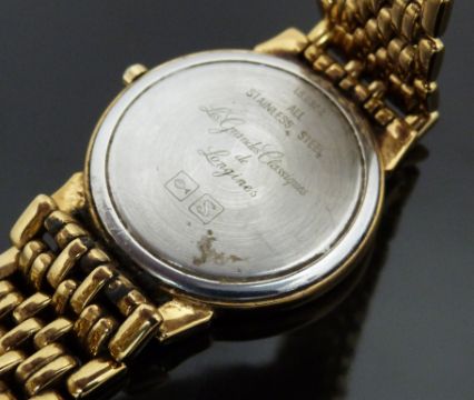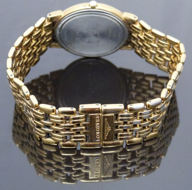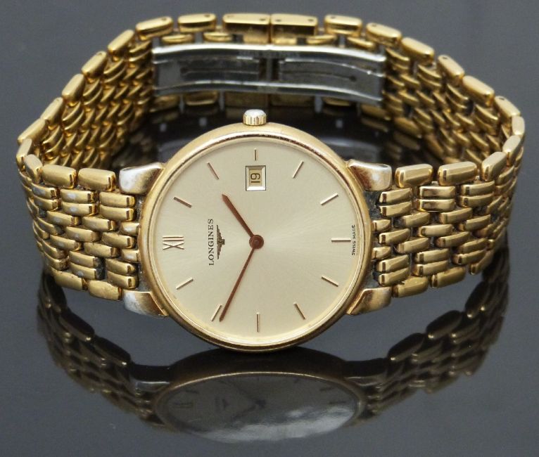 Longines Les Grandes Classiques gold plated gentleman's wristwatch ref. L5.632.2 with date aperture, gold hands, hour markers and dial and quartz movement, on gold plated bracelet, case diameter 34mm, serial number 26878811.