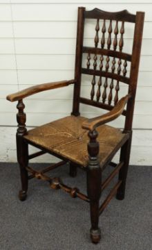 Seven 19thC rush seated dining chairs (6+1) with turned spar backs and tapering legs with pad feet, carver height 111cm