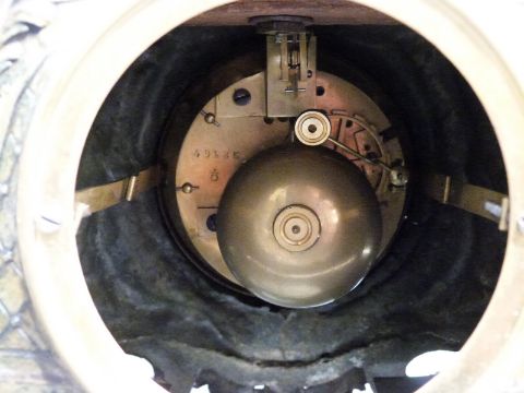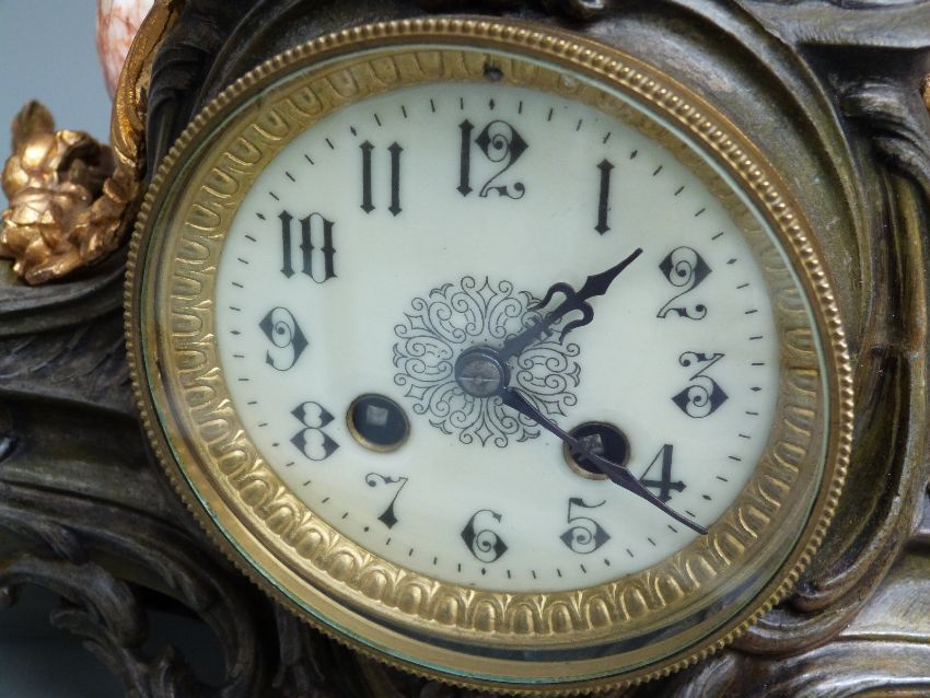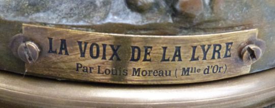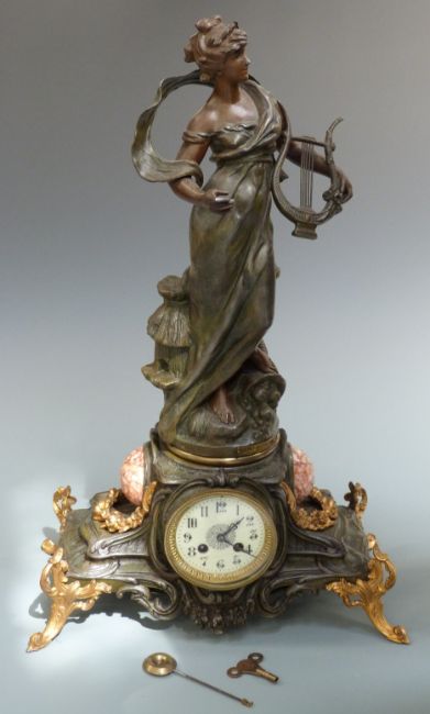 Early 20thC French figural clock in bronzed spelter finish depicting La Voix de la Lyre, signed Louis Morean. The numbered movement by Japy Freres striking on a bell, the ivory coloured enamelled dial with Arabic numerals and beetle and poker hands, standing on foliate bracket feet, 67cm tall