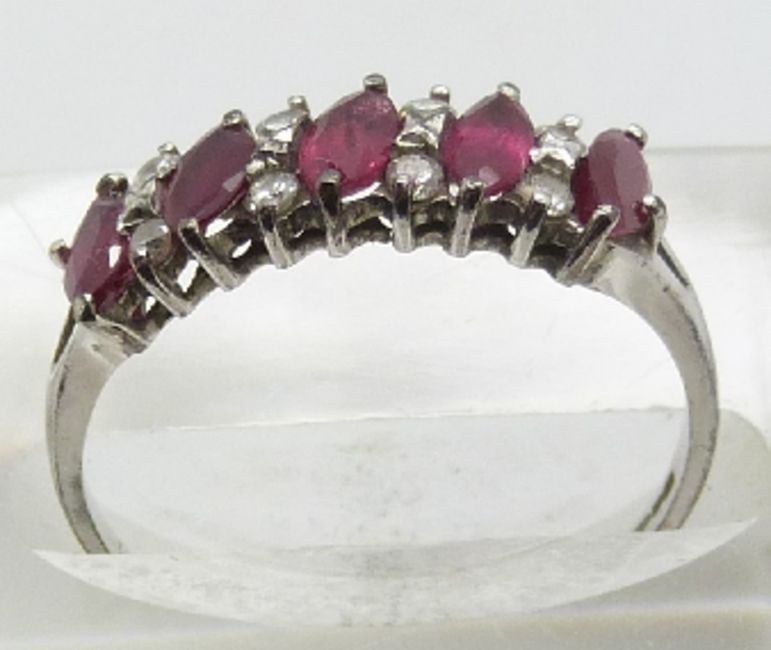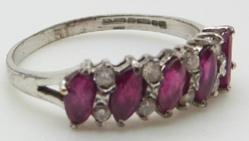 A 9ct white gold ring set with marquise cut rubies and diamonds, 1.9g, size K