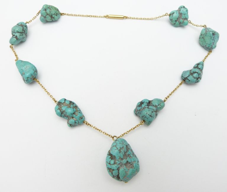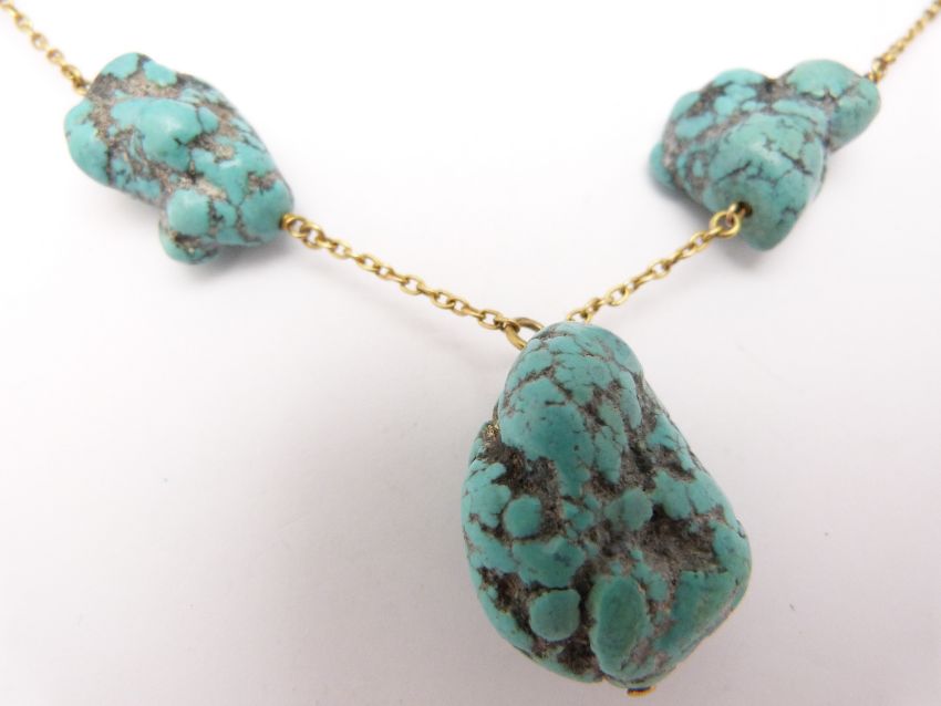 Victorian gold necklace threaded with turquoise boulders, 50.1g