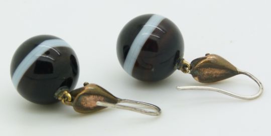 A pair of Victorian and banded agate earrings suspended on stylised snake head hangers