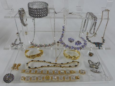 A collection of costume jewellery including beads, Waterman pen, silver necklace, cufflinks, Jewelcraft earrings and necklace, filigree necklace, brooches, watches etc