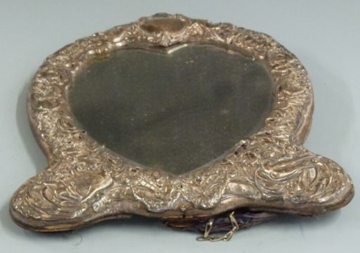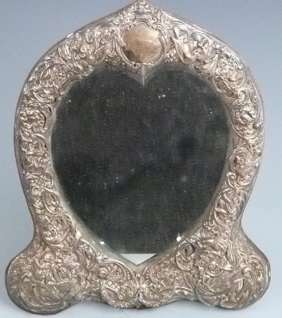 Victorian hallmarked silver heart shaped dressing table mirror with embossed frame decorated with birds, foliage and swags, having bevelled mirror and easel back, Chester 1899, maker's mark not found, height 33cm