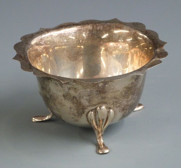 George V hallmarked silver sugar bowl with shaped edge and raised on three feet, marks rubbed but likely Chester 1923 maker The Goldsmiths Emporium, diameter 11cm weight 72g