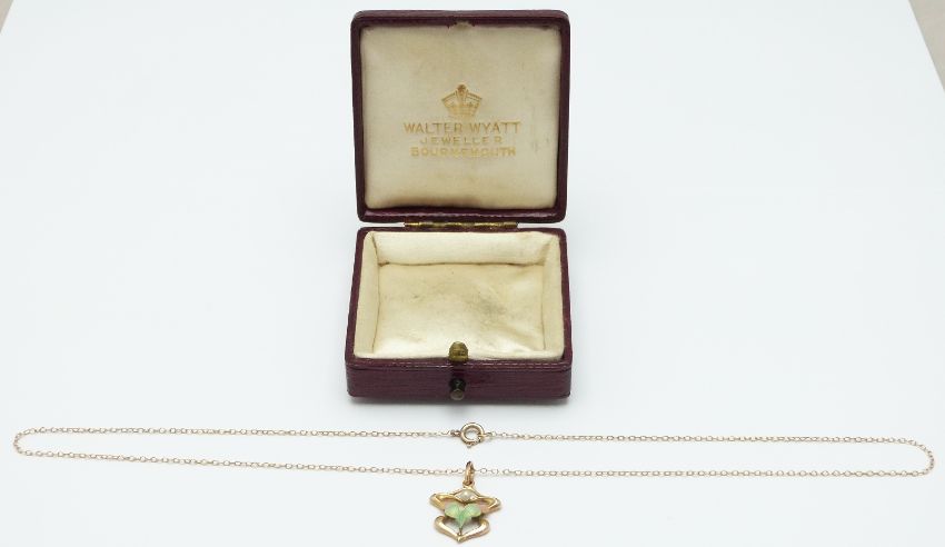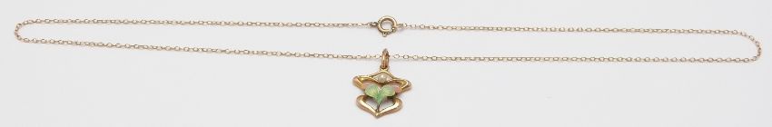 Art Nouveau 9ct gold pendant set with enamel and a seed pearl, in vintage box, 2g