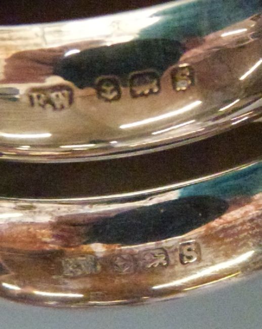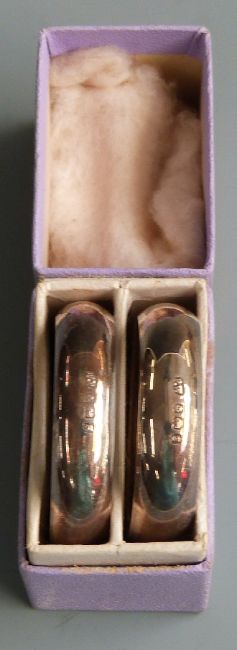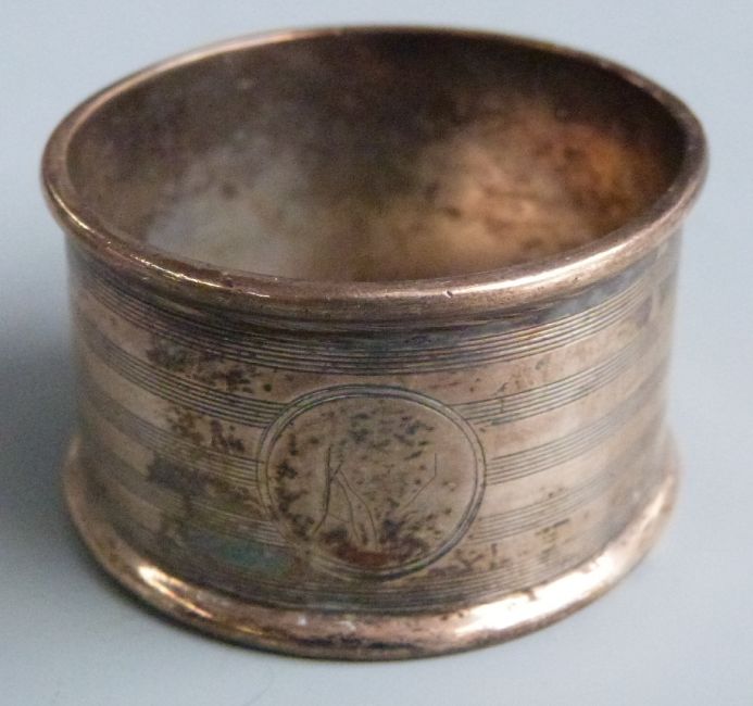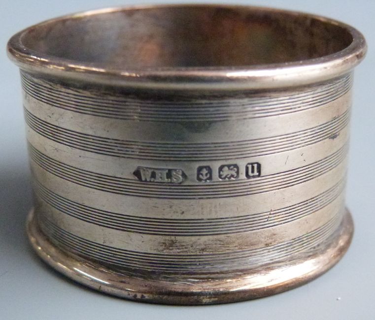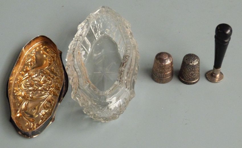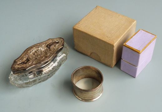 Five hallmarked silver napkin rings including two pairs, weight 68g together with a hallmarked silver thimble, silver lidded dressing table pot etc